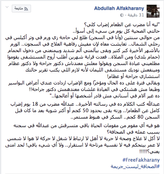 قالت صفحة الفخراني :”أن عبدالله كتب الكلام ده في رسالته الأخيرة.. عبدالله مضرب من 18 يوما إضراب كامل عن الطعام ، وزنه بقى بحدود 50 كجم أو أكتر شوية بعد ما كان قبل السجن 80 كجم.. السكر في هبوط مستمر”.