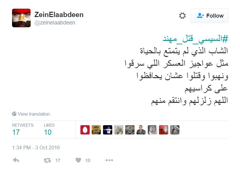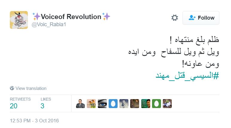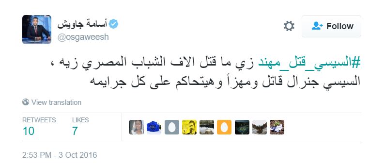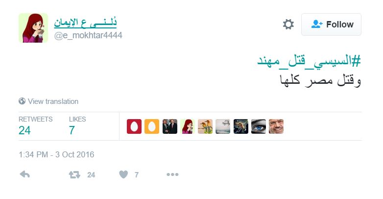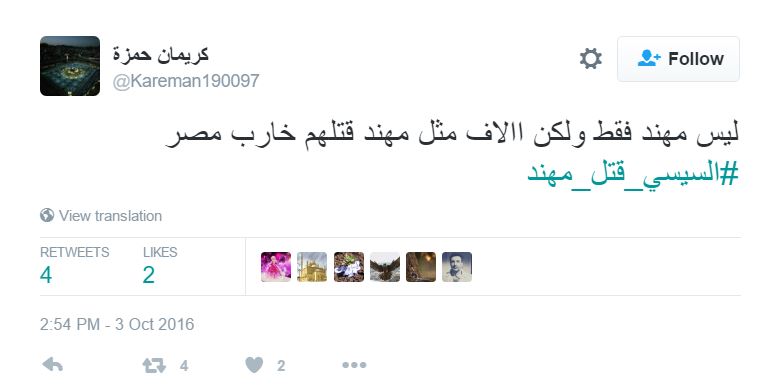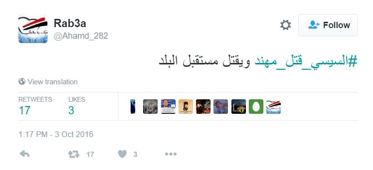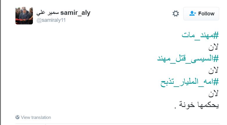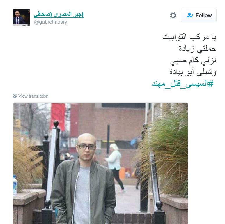 دشن رواد مواقع التواصل الاجتماعي هاشتاج “السيسي قتل مهند ” عقب إعلان خبر وفاة الطالب مهند إيهاب بعد معاناة مع مرض السرطان في إحدى مستشفيات بمدينة نيويورك بالولايات المتحدة الأمريكية.