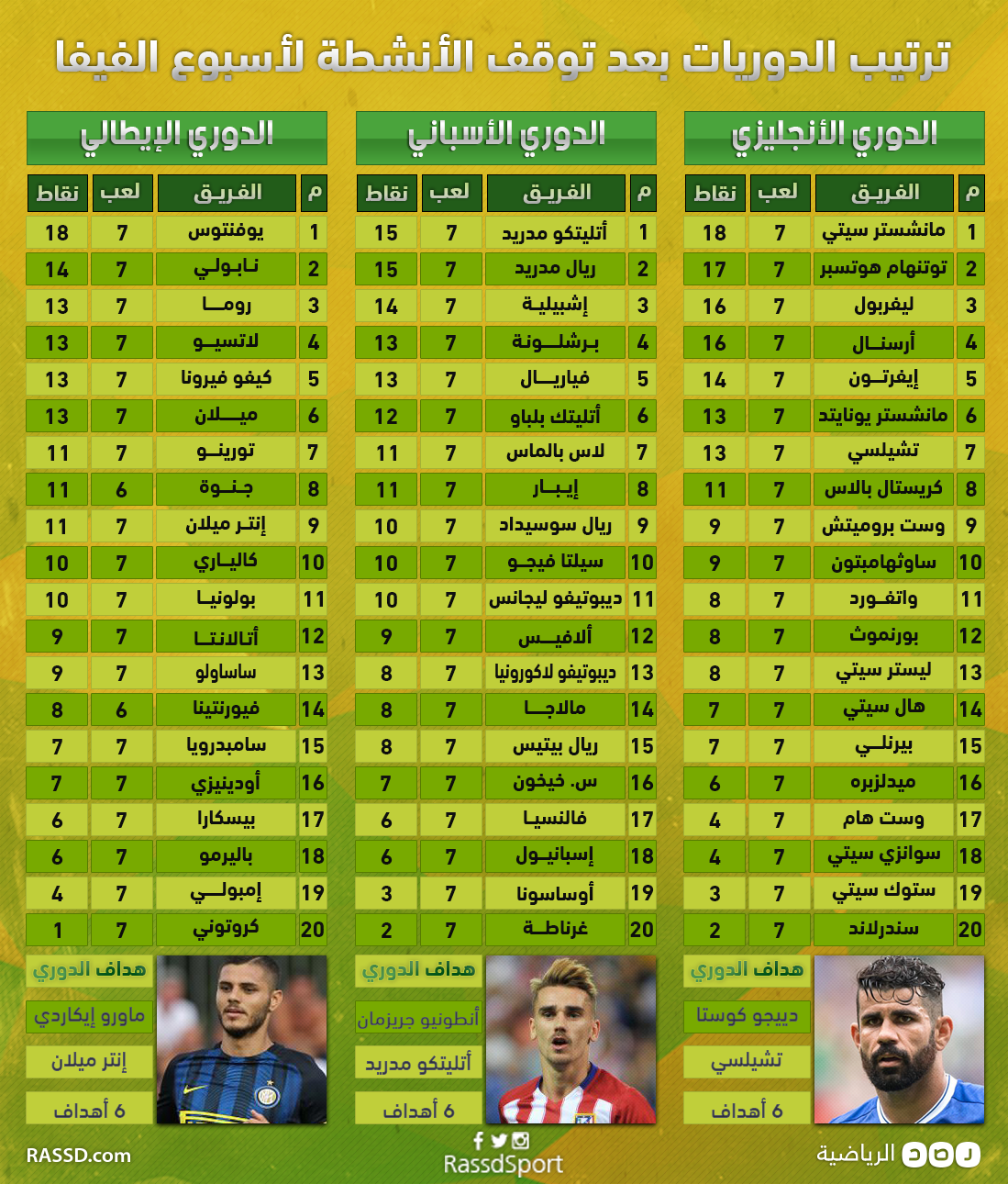توقفت معظم دوريات كرة القدم الأوروبية بسبب استعداد معظم منتخباتها لخوض مباريات هذا الأسبوع، ويعرض موقع “رصد” لمتابعيه إحصائية ترتيب كل من الدوري الإنجليزي، والإسباني، والإيطالي في الانفوجراف التالي.