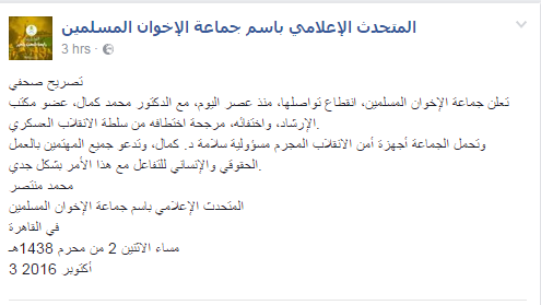 وكانت صحيفة اليوم السابع نشرت نبأ عن مصادر مطلعة، أوردت فيه أن أجهزة الأمن ألقت القبض على محمد كمال، عضو مكتب إرشاد جماعة الإخوان.