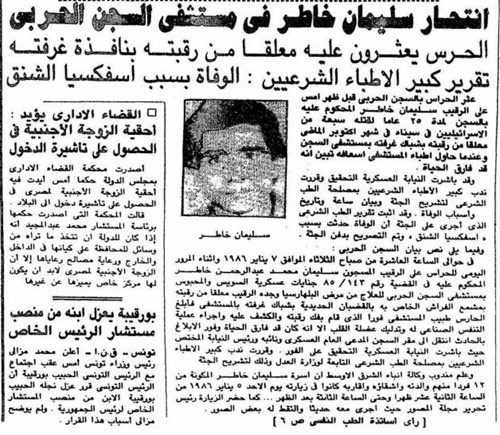 وفي يوم 7 يناير عام 1986م، الذي كان اليوم التاسع له في السجن، أعلنت الإذاعة المصرية وتداولت الصحف، خبر انتحار الرقيب سليمان خاطر، داخل محبسه بالسجن الحربي.