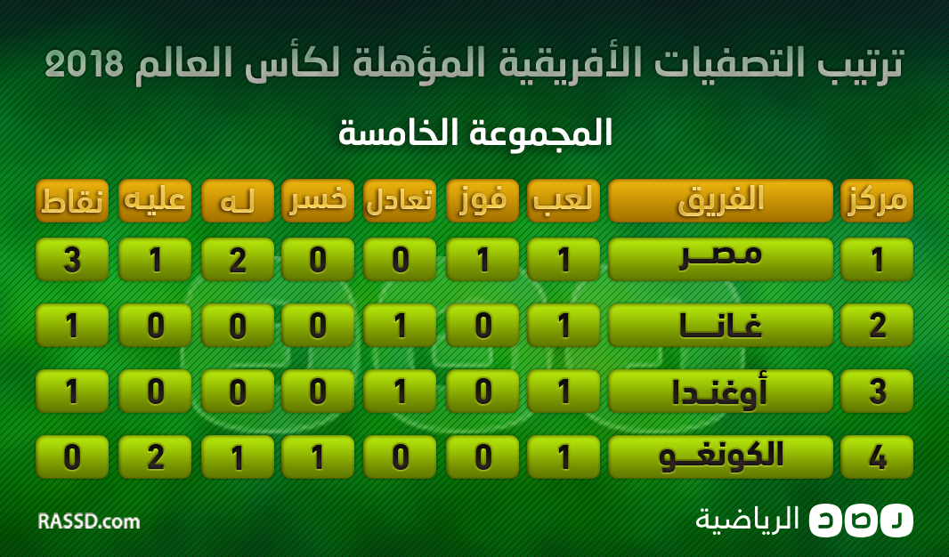 وبتلك النتيجة، يحقق منتخب مصر صدارة المجموعة الخامسة في التصفيات المؤهلة للمونديال، أمام فريقي غانا وأوغندا بنقطة لكلاً منهما، ثم الكونغو بدون رصيد.