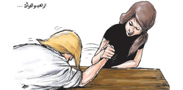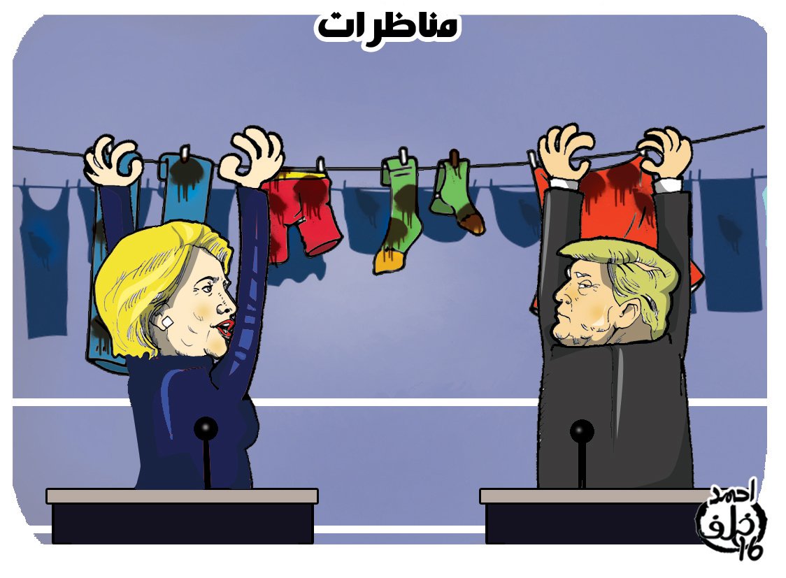 -عبرت أيضاً “الشرق الأوسط” عن الصراع بين ترامب وكلينتون في الانتخابات الرئاسية الأميركية بالكاريكاتير التالي: