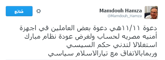 وأكد”حمزة” اليوم الجمعة ، في تغريده له عبر حسابه على موقع التدوين المصغر “تويتر”: أن دعوة ١١/١١هي دعوة بعض العاملين في اجهزة أمنيه مصريه، على حد قوله.