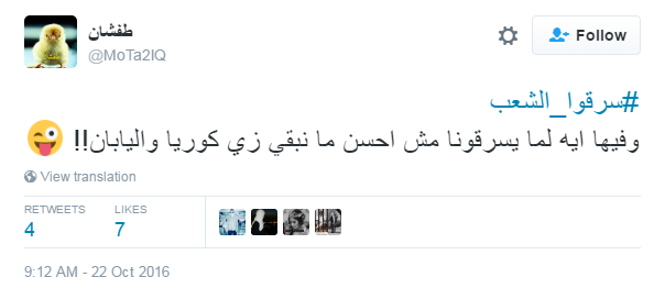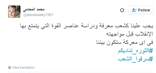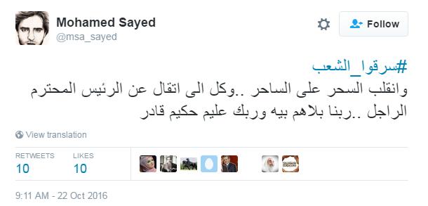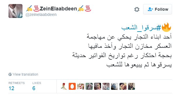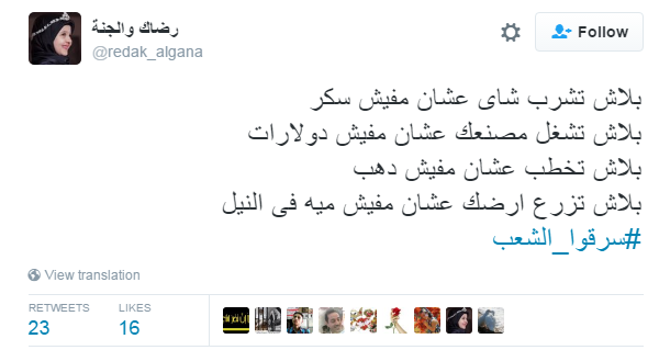 دشن مغردو موقع التدوينات القصيرة “تويتر” هاشتاج “سرقوا الشعب”، مؤكدين فيه على رفضهم لسياسات النظام الحالي، فيما طالب آخرون بمعرفة ودرسة عناصر الثوة التي يتمتع بها النظام قبل مواجهته في انتفاضة ثورية قادمة، في ظل الغلاء وارتفاع الأسعار وسقوط الجنيه المصري أمام العملات.