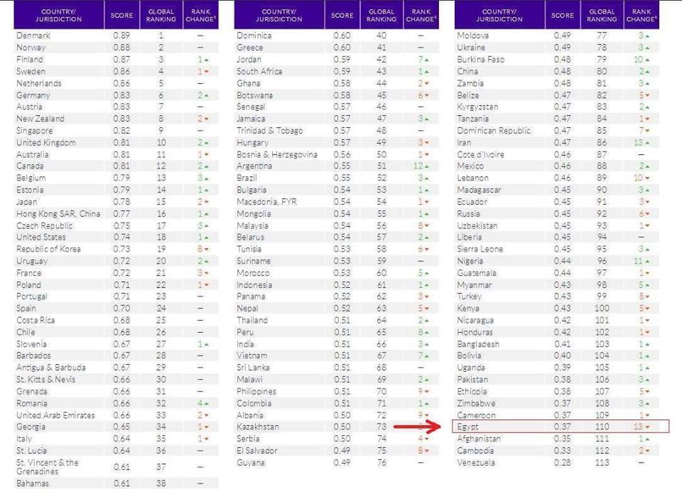 نشر مؤشر نزاهة القضاء العالمي، ترتيب 113 دولة علي مستوى العالم من حيث نزاهة السلطة القضائية وسيادة القانون.