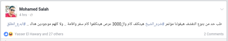 ومن جانبه قال الناشط السياسي محمد صلاح، :” صباح الخير على الغلابة اللي مش لاقيين كيس سكر .. وصباح الزفت على دماغ ال3000 معرض اللي راحوا يقعدوا 3 ايام في #شرم_الشيخ على حساب الشعب عشان يتصوروا مع #السيسي”.