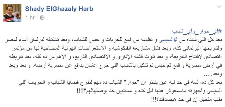 وتابع: “والأهم من ده كله، بعد تفريطه في أرض مصرية وقمع ثم حبس ثم تنكيل بالشباب اللي خرج عشان يدافع عن مصرية أرضه، وبعد وبعد وبعد…الخ، وبعد كل ده، لسه في حد ليه عين ينظر أن حوار الشباب ده مهم لطرح قضايا الشباب والحريات اللي السيسي وأجهزته ماسمعوش عنها قبل كده ومستنيين حد يوصلهالهم؟! طب متخيل أن في حد هيصدقك؟!”.
