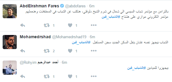 دشن رواد موقع التواصل الاجتماعي”تويتر” وسم “الشباب فين”، تزامنًا مع بدء فعاليات المؤتمر الوطني للشباب بمدينة شرم الشيخ ومشاركة 3000 شاب يمثلون الجامعات والرياضيين والمثقفين والأحزاب.