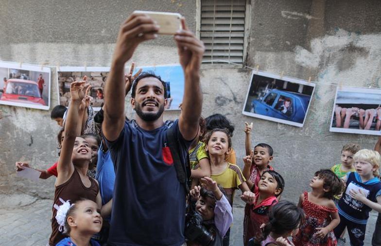 منذ عامين، يتجول الزعنون ( 24 عاماً) في مخيمات اللاجئين، والمناطق المُدمرة بفعل الحرب الإسرائيلية الأخيرة، والميادين العامة، من أجل عرض صوره بمشابك خشبية على “حبلٍ” وصفه بـ”المعرض”.