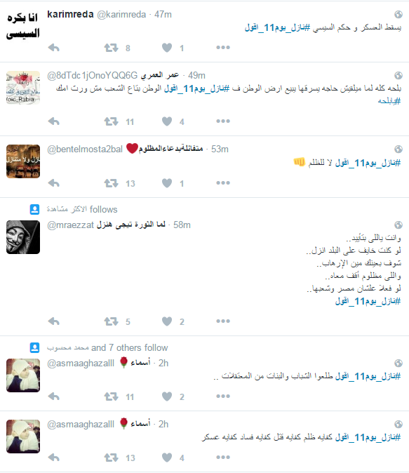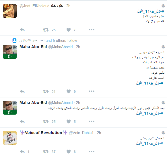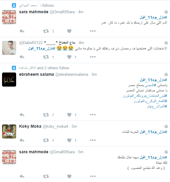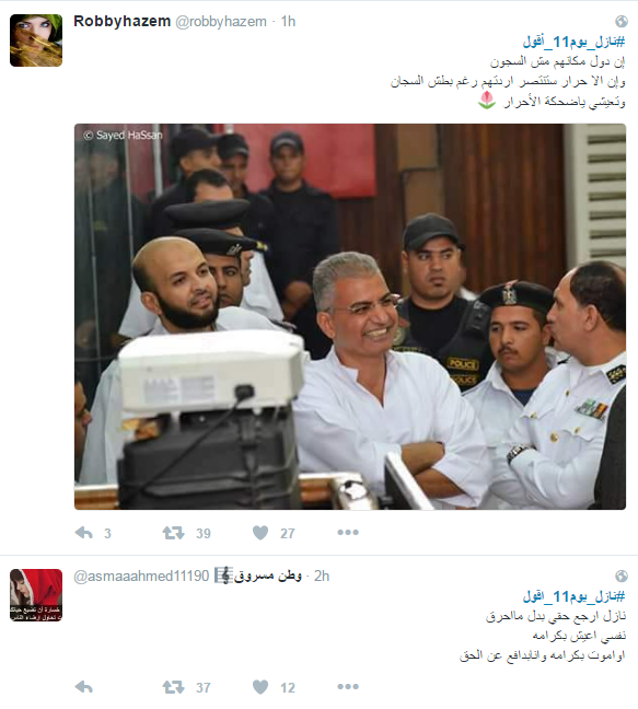 دشن نشطاء موقع التواصل الاجتماعي “تويتر” هاشتاج تحت وسم “#نازل_يوم11_أقول”، وسط دعوات يوم 11 نوفمبر، ومطالبات بالعيش والحرية والكرامة والإفراج عن المعتقلين السياسين،  ومطالبات برحيل حكم العسكر والسيسي، واستياء بعض النشطاء من غلاء الأسعار واختفاء بعض السلع الغذائية الأساسية.