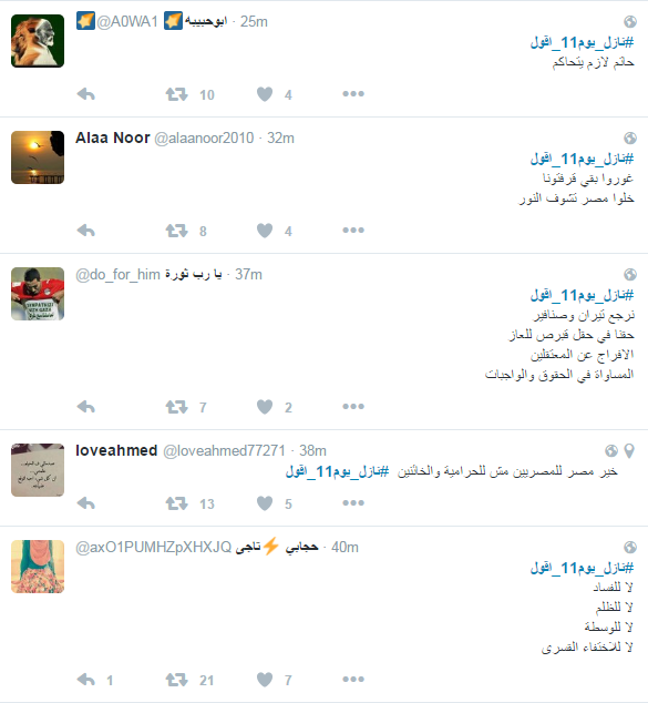 دشن نشطاء موقع التواصل الاجتماعى "تويتر" هاشتاج تحت وسم "#نازل_يوم11_اقول"، وسط دعوات يوم 11 نوفمبر ومطالبات بالعيش والحرية والكرامة والافراج عن المعتقلين السياسين