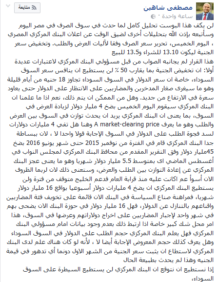 واستطرد: “وهل من الممكن ان يتم ذلك، نعم اذا ما علمنا ان البنك المركزي سيقوم اليوم الخميس بضخ 4 مليارات دولار لزيادة العرض في السوق، بما يعنى أن البنك المركزي يريد أن يحدث توازنًا في السوق بين العرض والطلب وهو ما يعرف A market-clearing price وهنا هل تفي 4 مليارات دولارات لسد فجوة الطلب على الدولار في السوق الإجابة قولاً واحدًا لا ، لأن ببساطة جدا البنك المركزي قام في الفترة من نوفمبر 2015 حتى شهر يونيو 2016 بضخ 45 مليار دولار وفق التقرير المقدم من محافظ البنك المركزي لمجلس النواب في أغسطس الماضي أي بمتوسط 5.5 مليار دولار شهريا”.