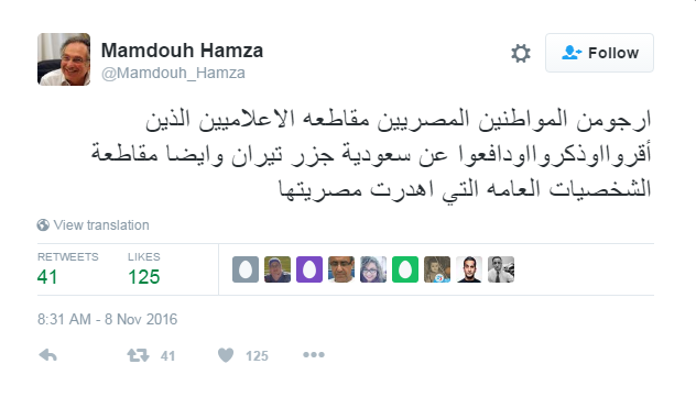 وكتب حمزة في تغريده، عبر حسابه على موقع التواصل الاجتماعى”تويتر”: “أرجو من المواطنين المصريين مقاطعة الإعلاميين الذين أقروا أو ذكروا أو دافعوا عن سعودية جزر تيران، وأيضًا مقاطعة الشخصيات العامة التي أهدرت مصريتها”.
