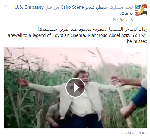 نعت الصفحة الرسمية للسفارة اﻷمريكية بالقاهرة، الفنان الراحل محمود عبدالعزيز، ونشرت له مقطع فيديو كوميدي مكون من عدة مقاطع من أعماله الفنية.