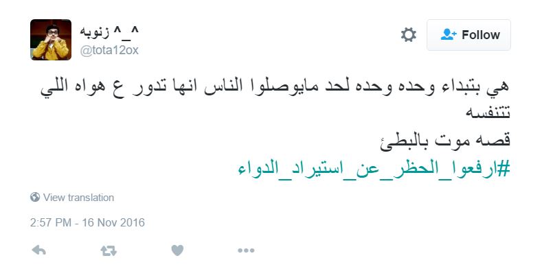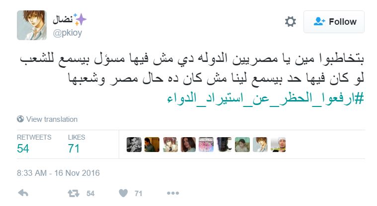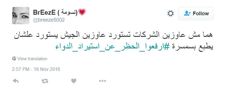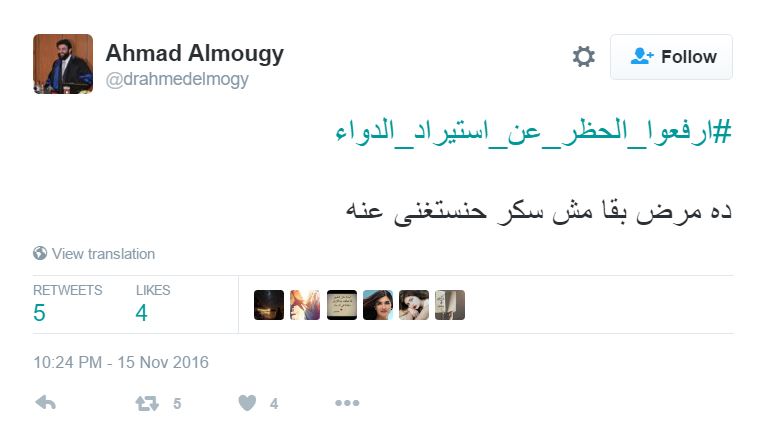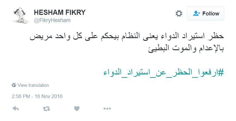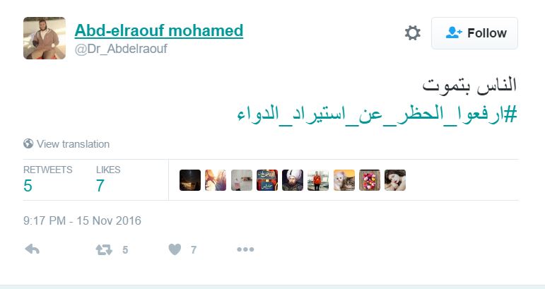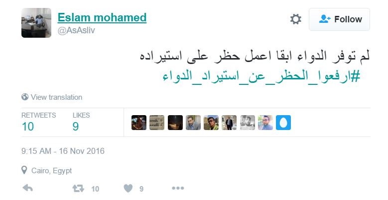 دشن رواد مواقع التواصل الاجتماعي هاشتاج باسم " #ارفعوا_الحظر_عن_استيراد_الدواء"، تعبيراً عن غضبهم لنقص عدد كبير من الأدوية داخل السوق المصري، بسبب فرض حظر على استيراد الأدوية.