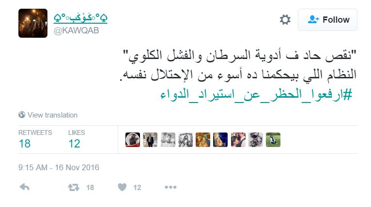 وتصدر الوسم، القائمة  الأعلى مشاركة في موقع التدوينات الصغير “تويتر”، بعد استجابة عدد كبير من المستخدمين لتفعيله، مطالبين بوقف الحظر وتوفير الأدوية اللازمة للمرضى.