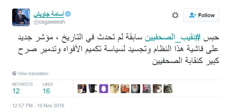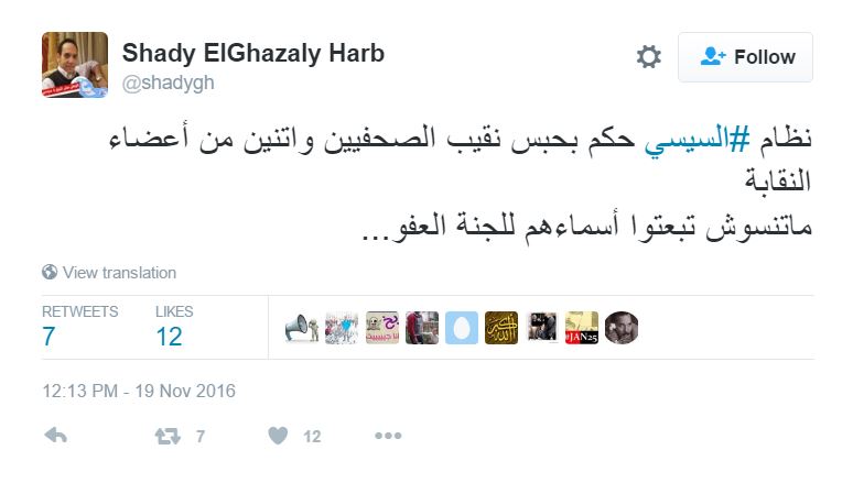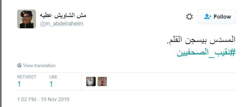 ودشن رواد موقع التدوينات الصغيرة “تويتر”، هاشتاج باسم “نقيب الصحفيين، بعد الحكم عليه بسنتين ، ومعه عضوي مجلس النقابة، خالد البلشي وجمال عبد الرحيم.