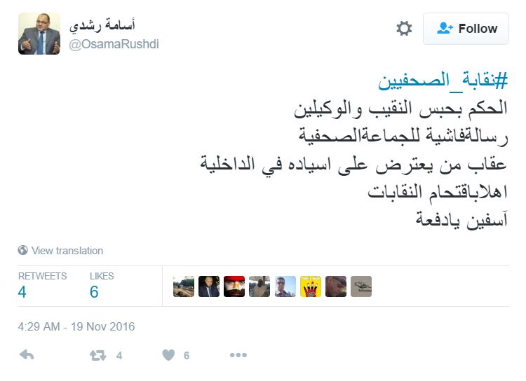 – د.طارق الزمر، رئيس حزب البناء والتنمية: “العدوان على نقابة الصحفيين جريمة متوقعة من نظام حارب كل الحريات وانتهك كل الخصوصيات ومن قبلها تعدى على الدماء”.