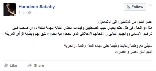 – حمدين صباحي: “مصر تنتقل من اللامقبول إلى اللامعقول.. هذا هو الحال فى ظل حكم يحبس نقيب الصحفيين وقيادات مجلس النقابة بتهمة ملفقة “.