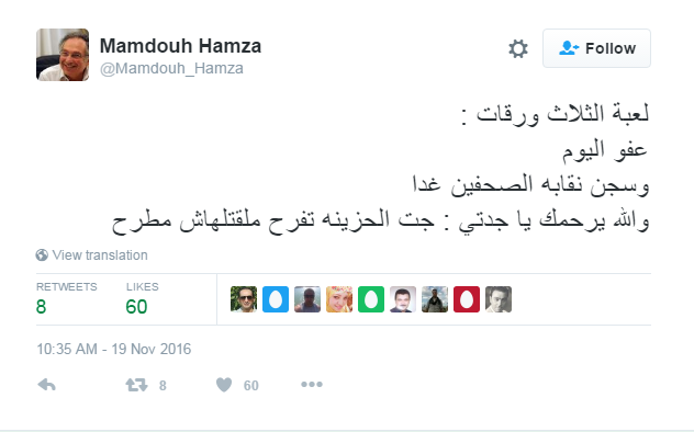 وكتب “حمزة “في تغريدة، عبر حسابه الشخصي على موقع التدوين العالمى” تويتر”: “لعبة الثلاث ورقات: عفو اليوم وسجن نقابة الصحفيين غدا والله يرحمك يا جدتي .. جت الحزينة تفرح ملقتلهاش مطرح”.