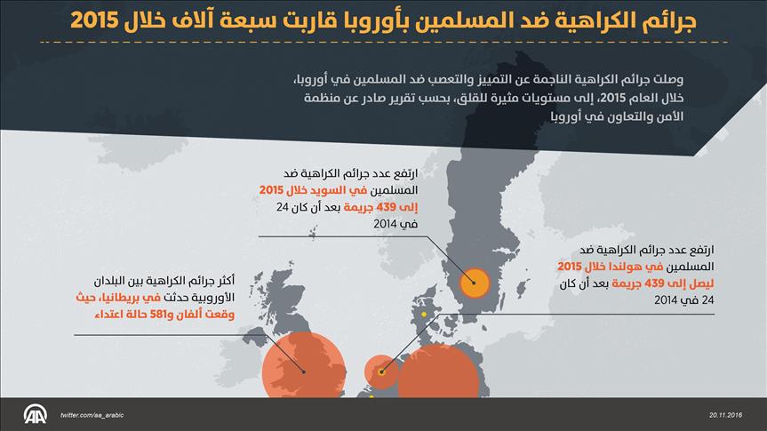 وصلت جرائم الكراهية الناجمة عن التمييز والتعصب ضد المسلمين في أوروبا، خلال العام 2015، إلى مستويات مثيرة للقلق، بحيث بلغت نحو ستة آلاف و811 جريمة في عدد من الدول الأوروبية، بحسب تقرير أوروبي.