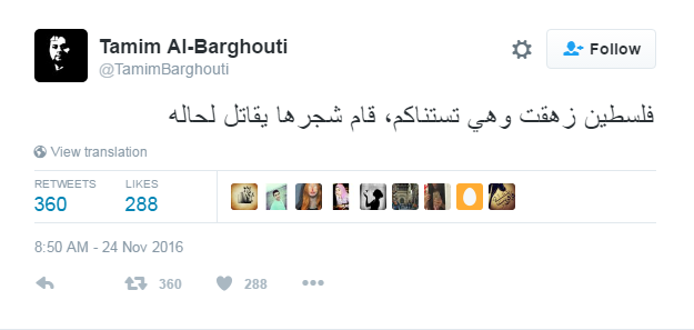 وقال في تغريدة عبر حسابه على موقع التدوين المصغر “تويتر”: “فلسطين زهقت وهي تستناكم، قام شجرها يقاتل لحاله”.