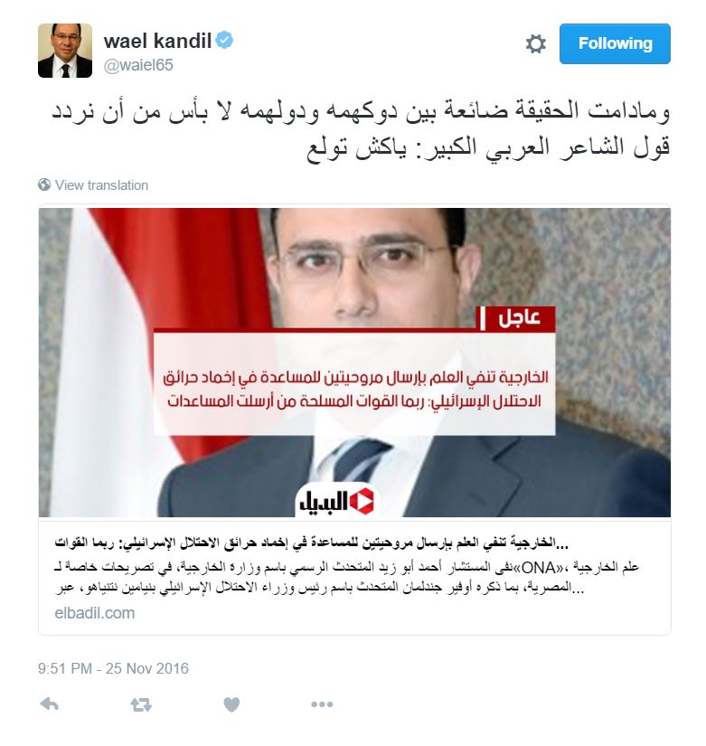 نشر الكاتب الصحفي وائل قنديل، خبر لنفي وزارة الخارجية علمها بإرسال مروحيتين للمساعدة في إخماد حرائق الاحتلال الإسرائيلي، منوهة أنه ربما القوات المسلحة من أرسلت المساعدات.
