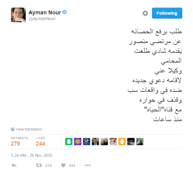 وكتب نور فى تدوينة له على موقع التواصل العالمي “تويتر”: “طلب برفع الحصانة عن مرتضى منصور، يقدمه شادي طلعت المحامي، وكيلاً عني لإقامة دعوى جديدة ضده في واقعات سب وقذف، في حواره مع قناه”الحياة” منذ ساعات”.