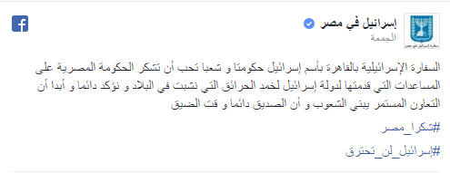 جدير بالذكر أن السفارة الإسرائيلية بالقاهرة، وجهت شكر لمصر، عبر صفحتها الرسمية على موقع “فيسبوك”، قالت : “باسم إسرائيل حكومة وشعبا نشكر الحكومة المصرية على المساعدات التي قدمتها لدولة إسرائيل لخمد الحرائق التي نشبت في البلاد ونؤكد دائما وأبدا أن التعاون المستمر يبني الشعوب وأن الصديق دائما وقت الضيق”.