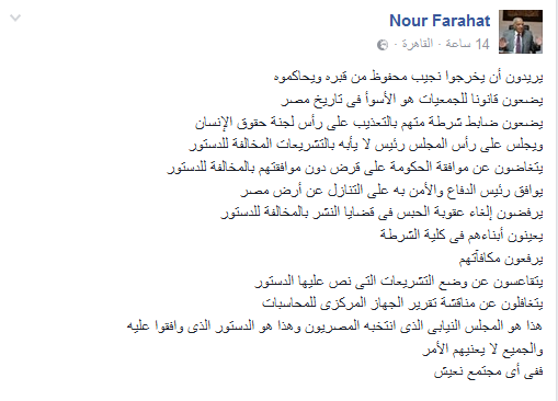 قال عبر منشور علي صفحته الشخصية “فيس بوك”: “يريدون أن يخرجوا نجيب محفوظ من قبره ويحاكموه.. يضعون قانونا للجمعيات هو الأسوأ فى تاريخ مصر.. يضعون ضابط شرطة متهم بالتعذيب على رأس لجنة حقوق الإنسان.. يجلس على رأس المجلس رئيس لا يأبه بالتشريعات المخالفة للدستور”.