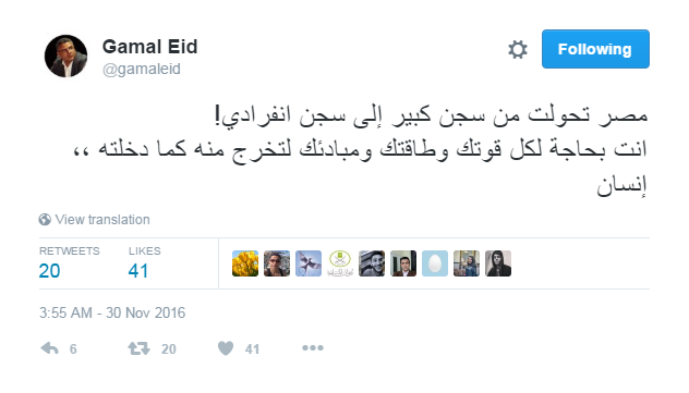 وأضاف عيد، أن مصر تحولت من سجن كبير إلى حبس انفرادي قائلاً: “مصر تحولت من سجن كبير إلى سجن انفرادي، أنت بحاجة لكل قوتك وطاقتك ومبادئك لتخرج منه كما دخلته.. إنسان”.