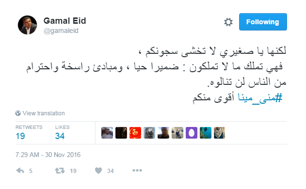 وقال عيد فى تدوينة عبر صفحته الشخصيه على موقع التواصل الاجتماعى “تويتر” :” لكنها يا صغيري لا تخشى سجونكم، فهي تملك ما لا تملكون: ضميرًا حيًا، ومبادئ راسخة واحترام من الناس لن تنالوه.. #منى_مينا أقوى منكم”.