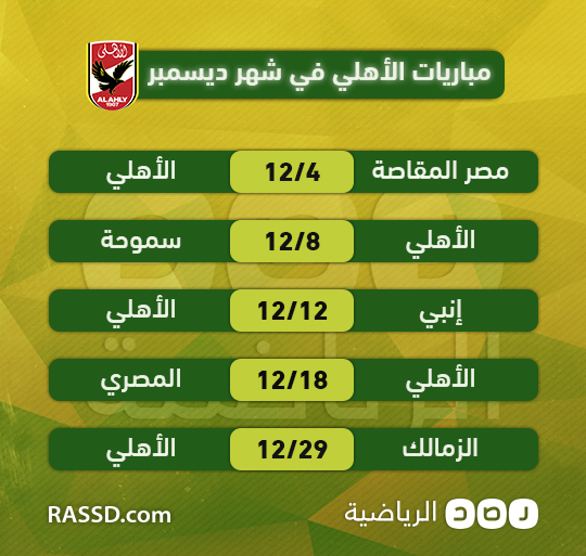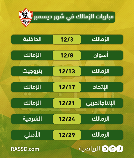 موقع “رصد” أعد لزواره الكرام، جدولاً يضم مباريات الأهلي والزمالك خلال شهر ديسمبر، نشاهدها في الصور الآتية:
