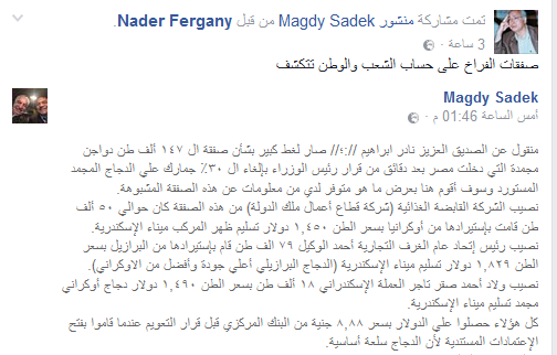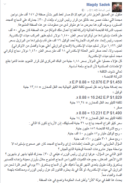 شارك “فرجاني” منشورا علي صفحته الشخصية “فيس بوك” للخبير السياحي مجدي صادق ،قال فيه :”صار لغط كبير بشأن صفقة الـ ١٤٧ ألف طن دواجن مجمدة التي دخلت مصر بعد دقائق من قرار رئيس الوزراء بإلغاء ٣٠٪‏ جمارك علي الدجاج المجمد المستورد وسوف أقوم هنا بعرض ما هو متوفر لدي من معلومات عن هذه الصفقة المشبوهة.