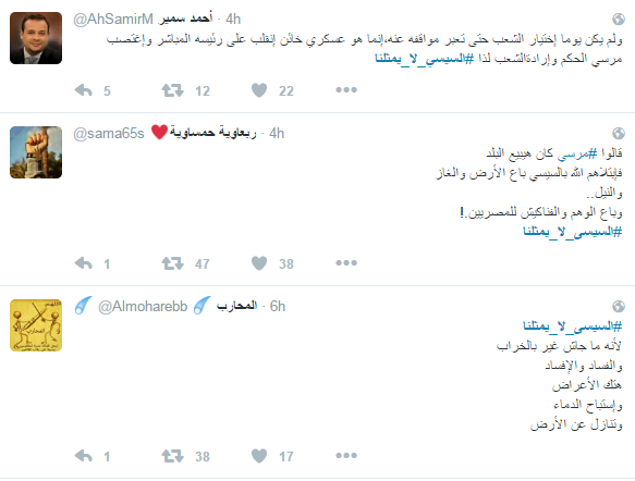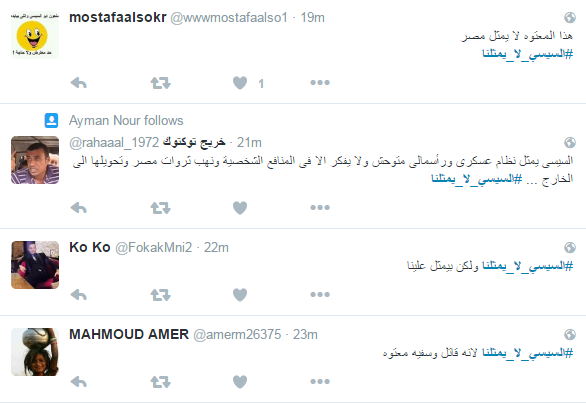 وشارك النشطاء تدوينة “السيسي بيمثل علينا” وأضاف أحدهم، “من جعل الإعلام كله متحدث رسمي للجيش والقنوات ليلاً نهارًا تمجد به ومؤسسات الدوله تسبح بحمده لا يمثلني”.