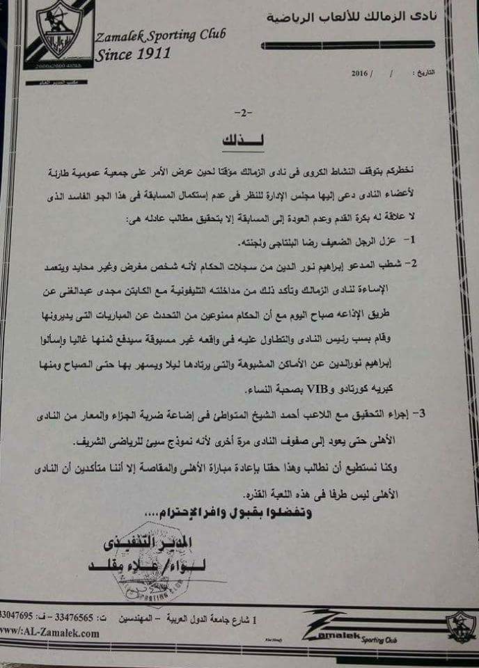 نخطركم بتوقف النشاط الكروى فى نادى الزمالك مؤقتا لحين عرض الأمر على جمعية عمومية طارئة لأعضاء النادى دعى إليها مجلس الإدارة للنظر فى عدم إستكمال المسابقة فى هذا الجو الفاسد الذى لا علاقة له بكرة القدم وعدم العودة إلى المسابقة إلا بتحقيق مطالب عادله هى: