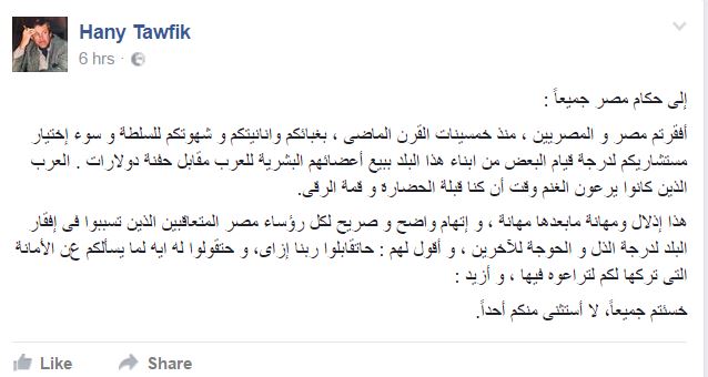 وقال توفيق في منشور له على موقع “فيس بوك”: “إلى حكام مصر جميعًا: أفقرتم مصر والمصريين ، منذ خمسينيات القرن الماضى، بغبائكم وأنانيتكم وشهوتكم للسلطة وسوء اختيار مستشاريكم لدرجة قيام البعض من أبناء هذا البلد ببيع أعضائهم البشرية للعرب مقابل حفنة دولارات. العرب الذين كانوا يرعون الغنم وقت أن كنا قبلة الحضارة وقمة الرقي”.