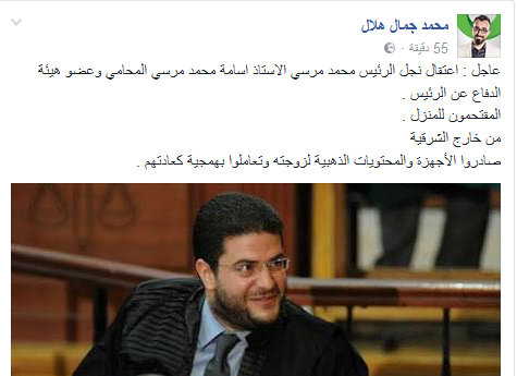 أعلنت أسرة الدكتور محمد مرسي، القبض علي نجلها والمتحدث باسم الأسرة أسامة مرسي.. وكتب عبدالله مرسي، عبر صفحته الشخصية "فيس بوك" :" تم اعتقال أخي أسامة، حسبنا الله ونعم الوكيل"