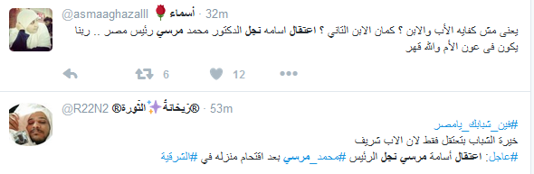 تم اعتقال”أسامة” نجل الدكتور مرسى، أثناء تواجده بالمنزل بمدينة الزقازيق بمحافظة الشرقية.