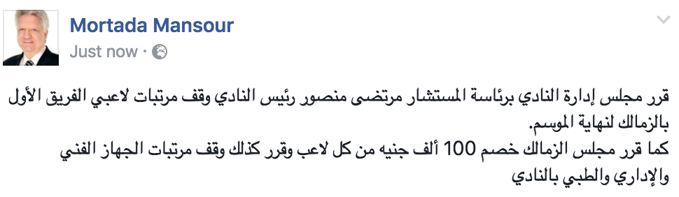 أصدر مرتضى منصور، رئيس نادي الزمالك، قرارات صارمة بمعاقبة لاعبي نادي الزمالك والجهاز الفني والإداري والطبي بالنادي.