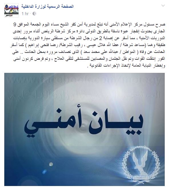 وأكدت الداخلية ان المواطن عبدالله على محمد سعد ، الذي توفى أثناء الحادث تصادف مروره بجانب سيارة الشرطة، وقت حدوث الإنفجار.