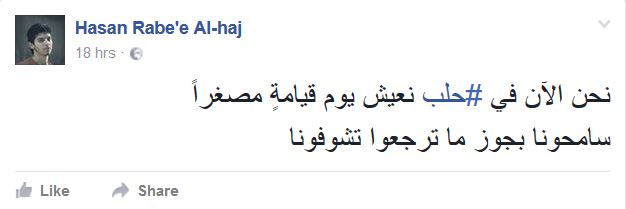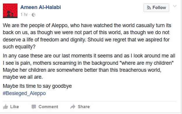 يقول المصور أمين الحلبي عبر منشور له على صفحته الشخصية في “فيس بوك”، “نحن شعب حلب.. رأينا العالم يدير ظهوره لنا، وكأننا لسنا جزًءا منه، وكاننا لا نستحق عيش الحرية والكرامة”، وتسائل، عما إذا كان أخطأ السورييون حينما أملوا في المساواة.