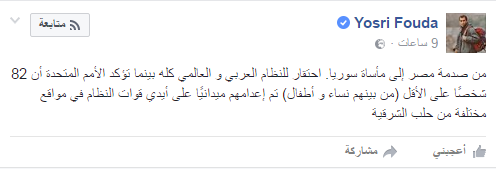 وكتب فودة في منشور عبر صفحته الشخصية بموقع التواصل الاجتماعي “فيس بوك”: “من صدمة مصر إلى مأساة سوريا.. احتقار للنظام العربي والعالمي كله، بينما تؤكد الأمم المتحدة أن 82 شخصًا على الأقل (من بينهم نساء و أطفال) تم إعدامهم ميدانيًا على أيدي قوات النظام في مواقع مختلفة من حلب الشرقية”.