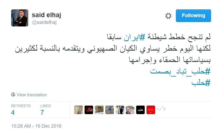 وقال الحاج في تغريدة له على موقع التدوينات الصغيرة “تويتر”، لم تنجح خطط شيطنة إيران سابقًا، لكنها اليوم خطر يساوي الكيان الصهيوني ويتقدمه بالنسبة لكثيرين بسياساتها الحمقاء وإجرامها، حلب تُباد بصمت حلب”.