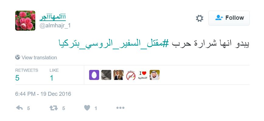 تصدر هاشتاج "#مقتل_السفير_الروسي_بتركيا"، قائمة الأوسمة الأكثر رواجًا في موقع التدوينات الصغيرة "تويتر"، بعد أن أفادت وكالات إعلام روسية وتركية وفاة السفير الروسي لدى تركيا، بعد إصابته مساء اليوم، في إطلاق نار بأنقرة.