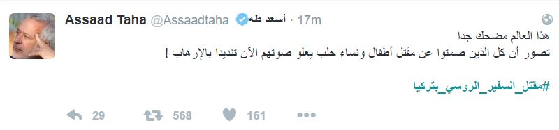 كما انتقد الكاتب الصحفي أسعد طه، تناول الخبر بالتنديد، في حين تُقتل أطفال ونساء سوريا في صمت.