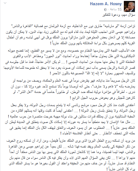 وأفاد:”من يريد أن تسكنه روح الطفل البرئ الذى يرى الملك عارياً فليفعل، ومن أراد أن تسكنه روح الخوف من ذكر الحقيقة كى يكسب العالم ويفقد نفسه فهذا شأنه … لكن بعيداً عن إبراهيم عيسى وعن القاهرة والناس، فهما ليسا قضيتنا، وما هما إلا كاشفان لعورة الملك التى يسير بها بين الناس معتقداً أن أحداً منهم لا يراها ! … لكن يبقى السؤال المهم الذى لابد وأن يفكر فيه كل الناس سواء من قال منهم بأن النظام قد صار عارياً، أو من خاف منهم من الحقيقة واعتقد أن القول بغيرها هو ما يستر الملك الذى يراه كل الناس عارياً !”