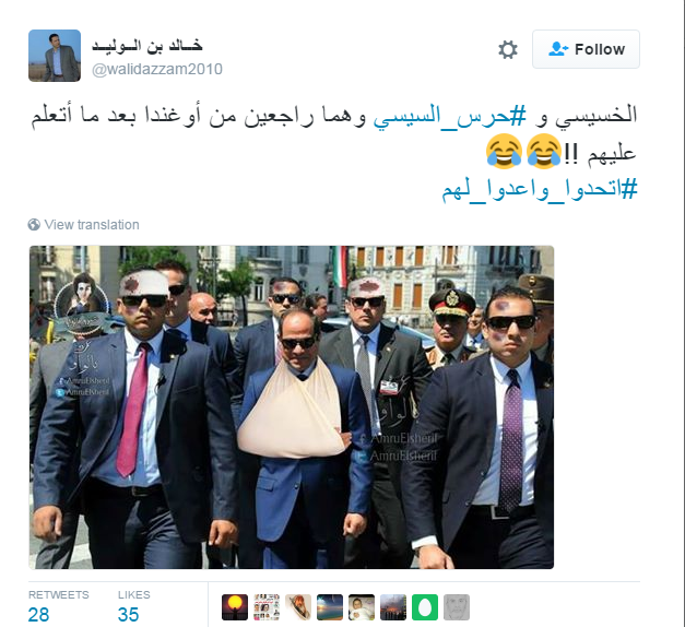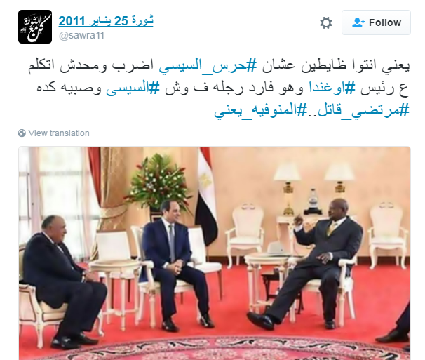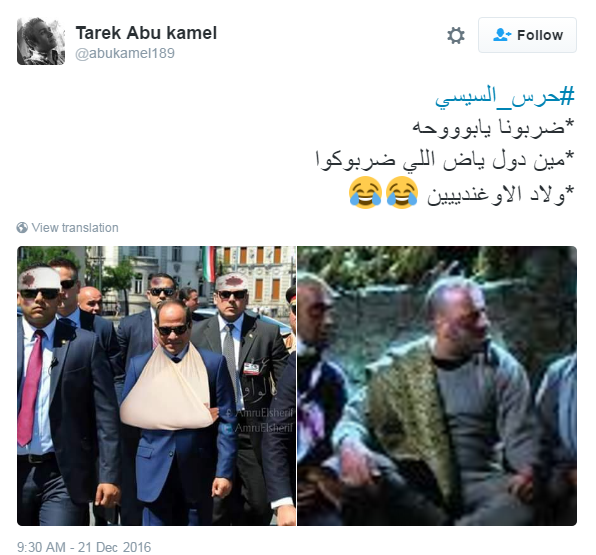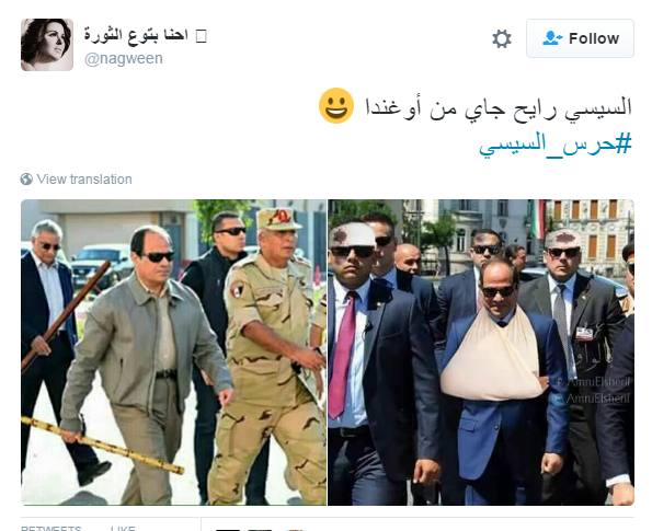 دشن مغردو موقع التدوين العالمي “تويتر” هاشتاج “حرس السيسي”، سخروا عبره من المشاجرة التي نشبت بين حرس عبدالفتاح السيسي، وحرس الرئيس الأوغندي، بعد رفضهم السماح لحراسة السيسي وعباس كامل الدخول إلى قصر الرئيس الأوغندي الذي اجتمع فيه مع السيسي.