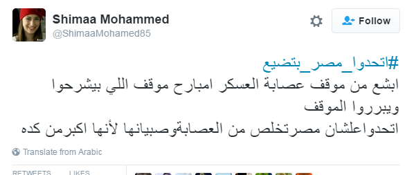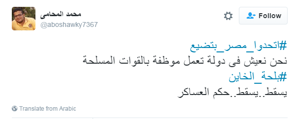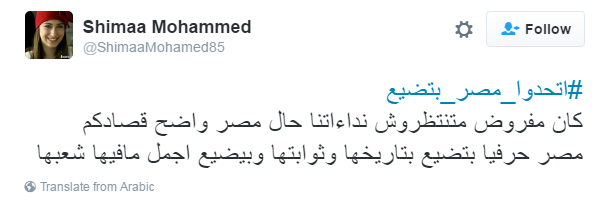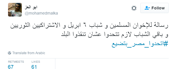 دشن مغردو موقع التدوين العالمي”تويتر” هاشتاج #اتحدوا_مصر_بتضيع، دعوا فيه الثوار بجميع تياراتهم للاتحاد لإسقاط نظام السيسي قبل أن تضيع مصر، موجهين دعوتهم لجماعة الإخوان و 6إبريل والإشتراكيين الثوريين وكل المصريين الذين شاركوا في ثورة يناير أو لم يشاركوا للوقوف ضد النظام العسكري.